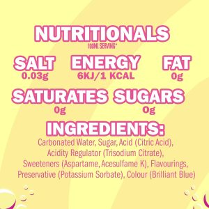 Carbonated Water, Flavourings,Acid (Citric Acid), Sweeteners (Acesulfame K,Sucralose,Aspartame), Preservative (Sodium Benzoate). Contains a source of Phenylalanine